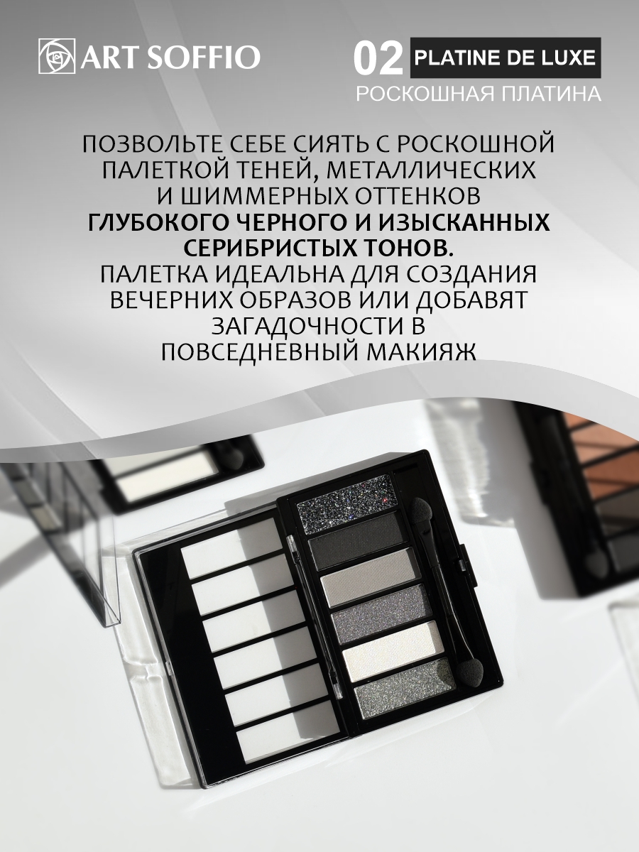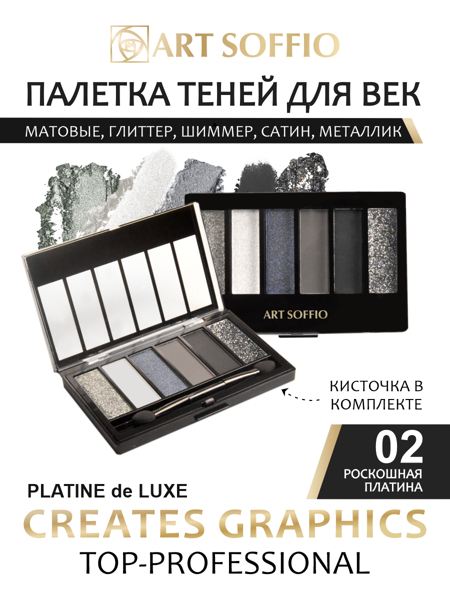 ПАЛЕТКА ТЕНЕЙ ART SOFFIO CREATS GRAPHICS 02 PLATINE DE LUXE • Роскошная Платина — истинное искусство сияния, которое создано для тех, кто хочет блистать, оставаться в центре внимания и подчеркивать свою индивидуальность.
